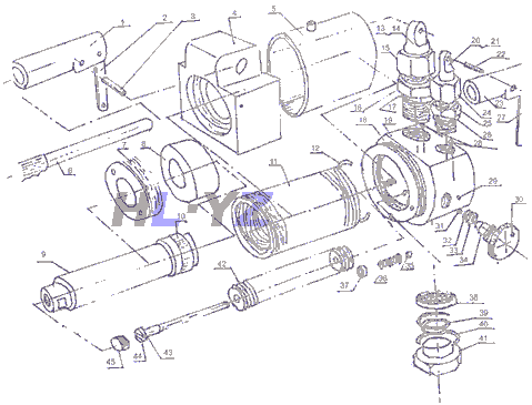 注意:長螺栓必須和拉簧(件42)螺孔完全脫開了,才可將活塞桿(件9)拉出。