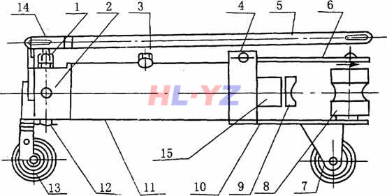 11、油箱;12、濾油器;13、前輪:14、手柄座;15、作用桿;