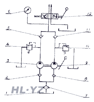 9-低壓泵 10-低壓安全閥 11-低壓排油閥 12-換向閥