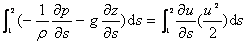 將上式沿流線s從截面1到截面2進(jìn)行積分,得