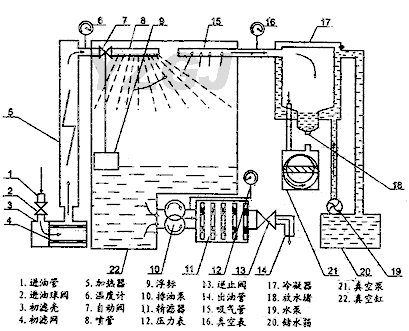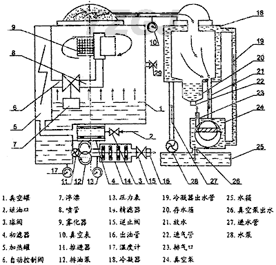連接好進(jìn)出油管油路,接通380V,接好完全地線,檢查各電路是否聯(lián)接可靠,各油路閥門(mén)是否打開(kāi),準(zhǔn)備無(wú)缺后,再進(jìn)行操作程序,先啟動(dòng)冷卻水泵,檢查水路循環(huán)是否正常,然后電動(dòng)真空泵,使泵內(nèi)的油能正常運(yùn)行,再使真空泵攔蓄運(yùn)轉(zhuǎn)。當(dāng)真空表達(dá)到極限時(shí),可打開(kāi)進(jìn)油閥,直止真空缸內(nèi)下視窗看見(jiàn)油面時(shí),即啟動(dòng)排油泵開(kāi)關(guān),開(kāi)始排油過(guò)濾雜質(zhì)。油路正常循環(huán)打開(kāi)加熱器開(kāi)關(guān),揮發(fā)油中的水份,如果油中水份較多時(shí),內(nèi)油沫會(huì)增高,此時(shí)必須打開(kāi)放氣閥控制適當(dāng)?shù)恼婵斩龋轀p少、油沫下降后關(guān)閉放氣閥,使真空達(dá)到極限。此時(shí)要注意各儀表的反應(yīng),如果壓力表讀數(shù)大于0.3MPa時(shí),說(shuō)明精濾器內(nèi),濾紙吸有較多的雜質(zhì),需要更換新的濾紙,工作完畢后,參看工作原理示意圖,打開(kāi)放氣閥,使真空度達(dá)到正常大氣壓,排完缸內(nèi)的油,剩下的油從放油堵內(nèi)放出,防止下次使用時(shí)混入不同型號(hào)的油中,在冬季特別注意,放凈真空泵內(nèi)和水箱內(nèi)的水,否則要凍壞真空泵和儲(chǔ)水箱。